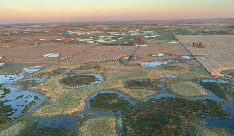 Las imágenes aéreas tomadas en estas últimas horas muestran la real magnitud del volumen de agua que está ingresando al partido por la zona sur desde varios sectores, esto sumado a los 700 mm. caídos en los primeros cuatro meses del año (marca que está muy cerca de alcanzar la media anual) provoca que los campos se encharquen indefectiblemente y los caminos se corten, los trabajos por mantenerlos conectados y transitables se hacen muy complejos y muchas veces el esfuerzo que se realiza no puede contra la fuerza de la naturaleza.
