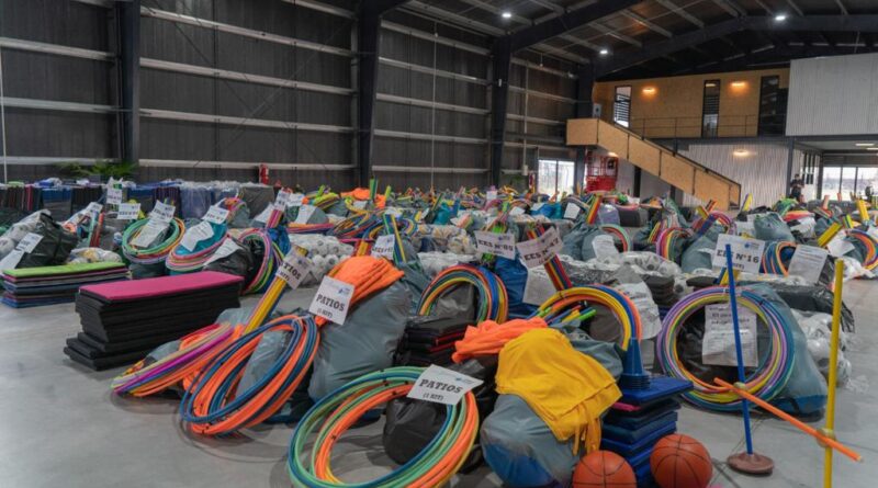 La intendenta de Moreno, Mariel Fernández, junto al director general de Consejos Escolares de la Provincia de Buenos Aires, Alejandro Perrone, entregó kits deportivos a 103 instituciones educativas y deportivas del municipio en Parque Industrial 2.
