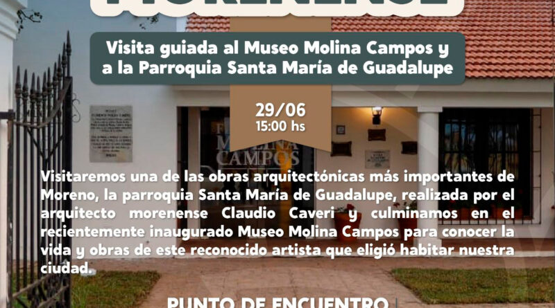 En esta oportunidad se visitarán la parroquia “Santa María de Guadalupe”, realizada por el arquitecto Claudio Caveri, y el recientemente inaugurado museo “Florencia Molina Campos”, para conocer la vida y obras de este reconocido artista internacional. El punto de encuentro será en la esquina de Av. Victorica y Molina Campos.