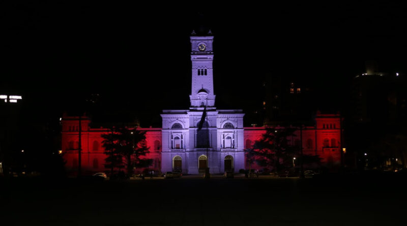 La Municipalidad de La Plata se iluminó con los colores rojo y blanco durante la noche de este 4 de agosto, fecha en que se conmemoran los 119 años de vida de la histórica institución platense.